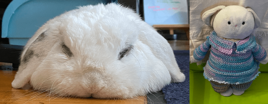 After many years of tear soaking and machine washing, the fabric on the bunny plush aged and I can no longer repair it by sewing. Recently, I decided to make the bunny plush a new outfit after acquiring the absolute basic skill in doing crochet and knitting.